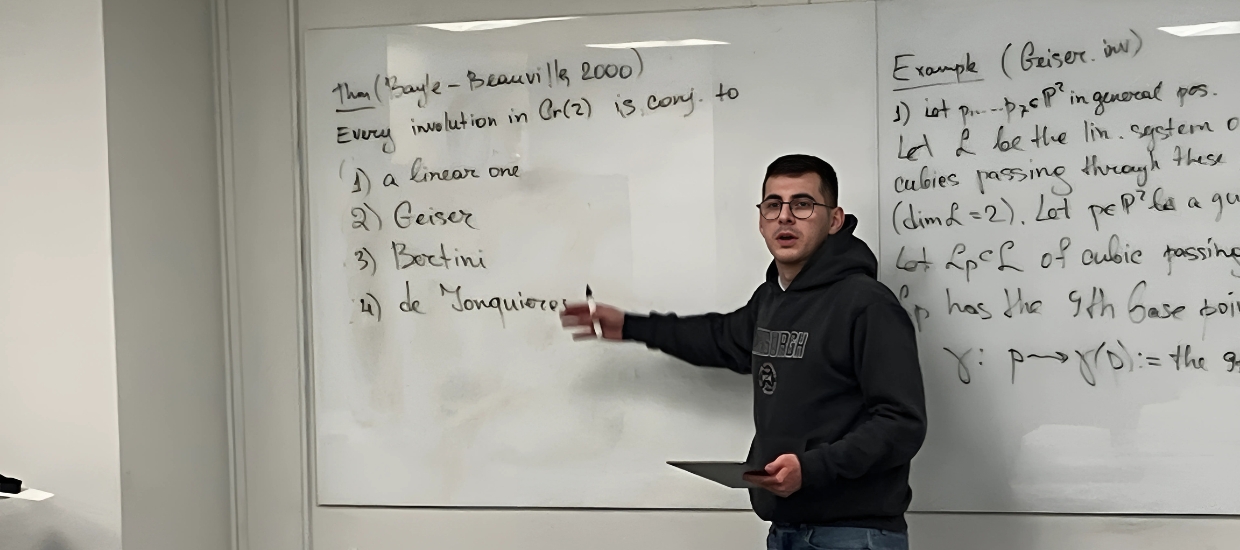Dates: January 23 & 24, 2025 Paolo Cascini, Imperial College London: On the birational geometry of algebraically integrable foliations I will report regarding some recent results on the Minimal Model Program for algebraically integrable foliations and some of their applications. Video Ivan Cheltsov, University of Edinburgh: Which cubic 3-folds are rational? By the beautiful theorem of Clemens and Griffiths, all smooth cubic 3-folds are irrational. On the other hand, all singular complex cubic 3-folds (except cones over smooth cubic curves) are known to be rational. In this talk, we will survey what is known about rationality of singular real cubic 3-folds - some of them are rational and some of them are irrational. This is a joint work with Yuri Tschinkel and Zhijia Zhang from New York. Video Phillip Griffiths, IAS & UM: “Invariants of normal functions” (Talk based on correspondence and ongoing work with Mark Green and Rodolfo Aguilar.) Normal functions originally arose in the works of Picard and Poincaré in algebraic geometry as a method for studying curves C on an algebraic surface S using the intersections of C with the curves in a generic pencil of hypersurface sections of S. This method was then used by Lefschetz as a central ingredient in his proof of the famous (1,1) theorem. Normal functions have since been generalized and provide a Hodge-theoretic method for studying both the local and global properties of algebraic cycles varying in a family of generically smooth algebraic varieties. In recent years there have been significant developments in the theory. These include the understanding of the singularities of normal functions, the use of normal functions in physics (as multi-valued sections of Lagrangian fibrations, the study of D-branes,..), and the introduction and use of higher normal functions in arithmetic questions (study of regulators, ..). In fact these two strands may be intertwining, as been noted in the physics literature but has yet to materialize. There are two basic essentially algebraic invariants associated to the transcendental normal functions. One of these is the infinitesimal invariant delta(v), and the other is the inhomogeneous Picard-Fuchs equation Pv=f. An interesting question is how is: How related is the information in theses two invariants? There are some general structural results that set a context, but the richness of the theory resides in the specific examples. In this talk we will explain some of this story, focusing on the case of Calabi-Yau (CY) 3-folds. Similar results seem to be present for the case of CY pairs (X,Y) where X is Fano and Y is an anti-canonical divisor. Video Ludmil Katzarkov, UM: The theory of Atoms We will introduce new birational invariants. Examples and relation with othe birational invariants will be considered. More examples will be considered in the talk of L. Cavenaghi. Video Reception Arman Sarikyan, The Maxwell Institute: Linearisation problem for the plane Cremona group One of the main challenges in equivariant birational geometry is the classification of finite subgroups of the group of birational automorphisms of the n-dimensional projective space, also known as the Cremona group. To address this problem, it is natural to first classify subgroups of the Cremona group that are conjugate to subgroups acting biregularly on the n-dimensional projective space, i.e., subgroups of PGL(n+1). Such subgroups are called linearisable. While the Cremona group coincides with PGL(2) for n=1, it turns out that already for n>1, the classification becomes more intricate. In this talk, we will present a complete classification of the linearisable subgroups of the Cremona group for n=2. Video Leonardo Cavenaghi, CAMPINAS: Atoms meet symbols In this talk, we add the needed concepts to the "Theory of Atoms" recently introduced by Katzarkov-Kontsevich-Pantev-Yu and show how one can combine it with the "symbols" introduced by Tschinkel-Kontsevich in 2019 in the frame of $G$-equivariant birational geometry, to obtain a new $\mathbb Z$-module that retains $G$-equivariant birational geometric information. We derive certain $\mathbb Z$-values $G$-equivariant birational invariants from that. Zhijia Zhang, New York University: The volume preserving Cremona group In this talk, we study the group of birational automorphisms of projective spaces that preserve the standard torus-invariant volume forms with logarithmic poles. This group is of interest in birational geometry due to its close connection to the theory of log Calabi-Yau pairs. In particular, we show that this group is not generated by pseudo-regularizable maps, and it is not simple. This extends a recent result on the Cremona group by Lin and Shinder. This is joint work with Konstantin Loginov. Video Rene Mboro, UM: Remarks on varieties of essential ${\rm CH}_0$-dimension at most 2. We present the notion (due to Voisin) of essential ${\rm CH}_0$-dimension of a variety a give sufficient conditions for a variety with trivial group of 0-cycles and essential ${\rm CH}_0$-dimension at most 2 to have, in fact, essential ${\rm CH}_0$-dimension 0 (i.e. to admit a Chow-theoretic decomposition of the diagonal). Video Kaiqi Yang, UM: Potentially stably rational conic bundle over non-closed field In this talk, we will explore the cohomological (H1) obstruction to the stable rationality of conic bundles over non-closed fields. This obstruction imposes specific conditions on the generators of the associated Galois group. The cohomological condition is preserved under orbit decomposition. Furthermore, we demonstrate the existence of several distinct classes of groups that satisfy the (H1) condition. Video Kyoung-Seog Lee, POSTECH: Motivic aspects of generalized logarithmic transformations Logarithmic transformation is an important operation introduced by Kodaira in 1960s. One can obtain an elliptic surface with multiple fibers by performing logarithmic transformations on an elliptic surface witho