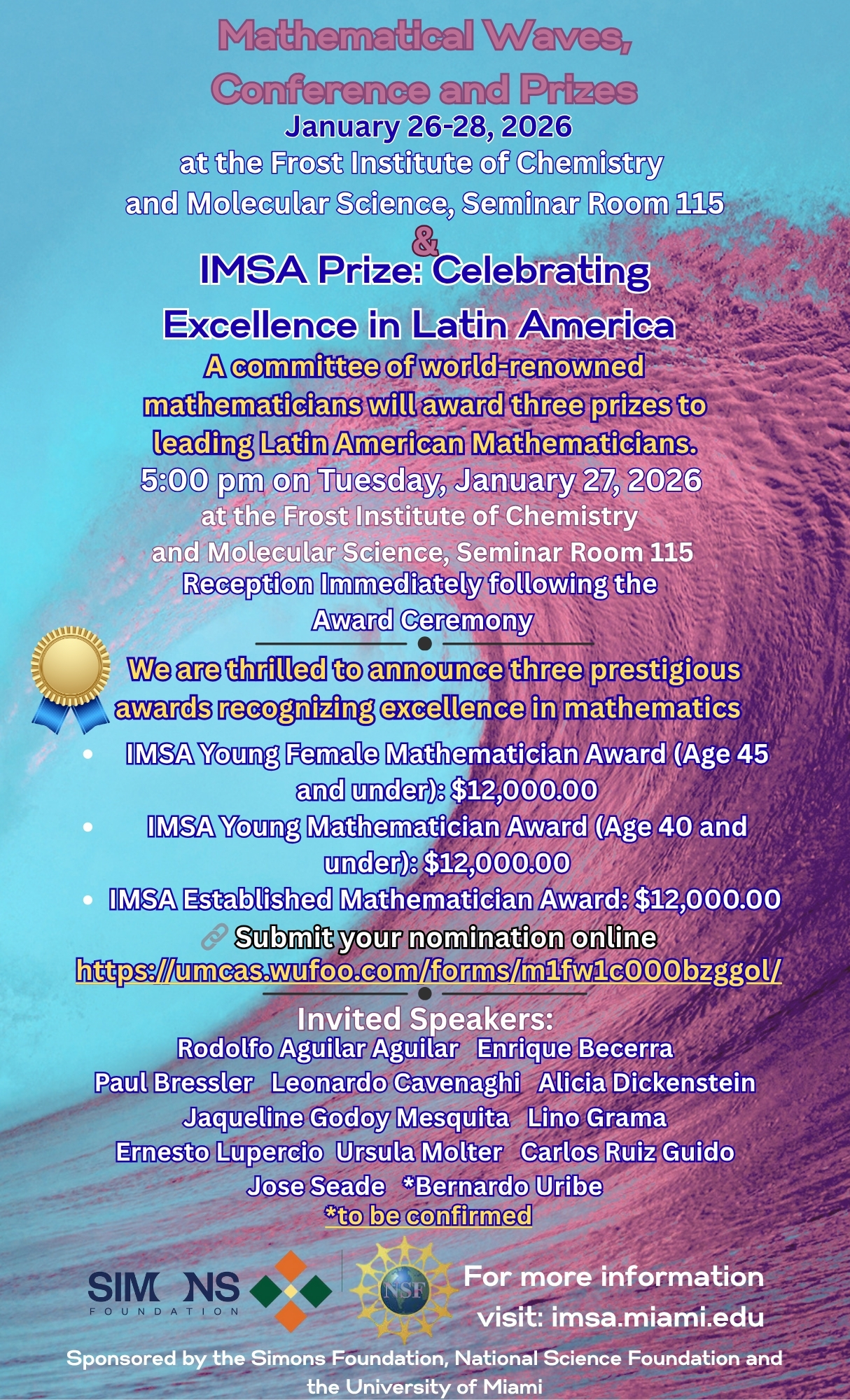 Conference Dates: January 26-28, 2026 This is the conference of an IMSA series of conferences. The goal of these conferences is to demonstrate recent developments in Mathematics and promote Latin American Mathematicians. *TO BE CONFIRMED Submission Deadline: Friday, December 5, 2025 Mathematicians working in Latin America who are under the age of 45 (for women) or 40 (for men) as of the date of the ceremony. A committee of world renowned mathematicians will award three prizes to leading Latin American mathematicians. The ceremony will take place: Wednesday, January 28, 2026 (5:30PM EST Time, US)